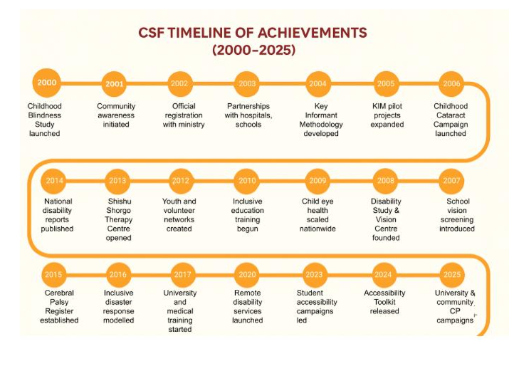 2012: CSF has completed study on childhood disability in BangladeshOrganised international training course on Key Informant Method to detect visual impairment children among participants from Asian countries (Afghanistan, China, India, Indonesia and Thailand)